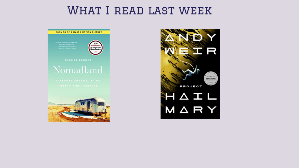 Nomadland– I listened to this on audio. I was captivated by the fact that this whole sector of the aging population goes place to place in their RV or camper vans. What sets this apart from all the other camping stories is that this is not your typical camper with very expensive RV’s. The people in this book primarily used camper vans; instead of staying at a costly campground,s they “parked” on public land.