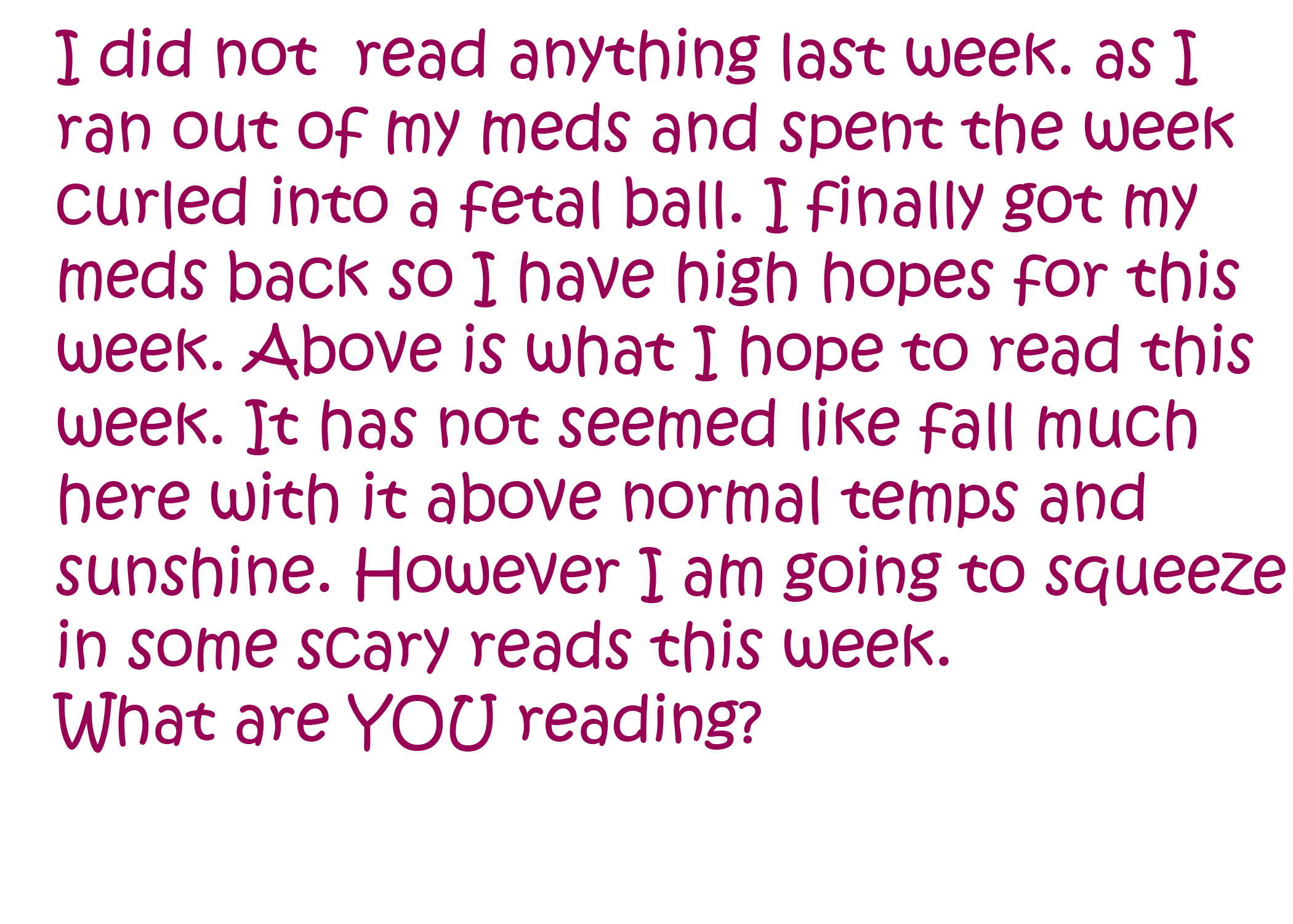 Meds -so important, glad you have them now and are aiming for a good reading week, with some scary material there, no doubt to see Halloween through. Enjoy.