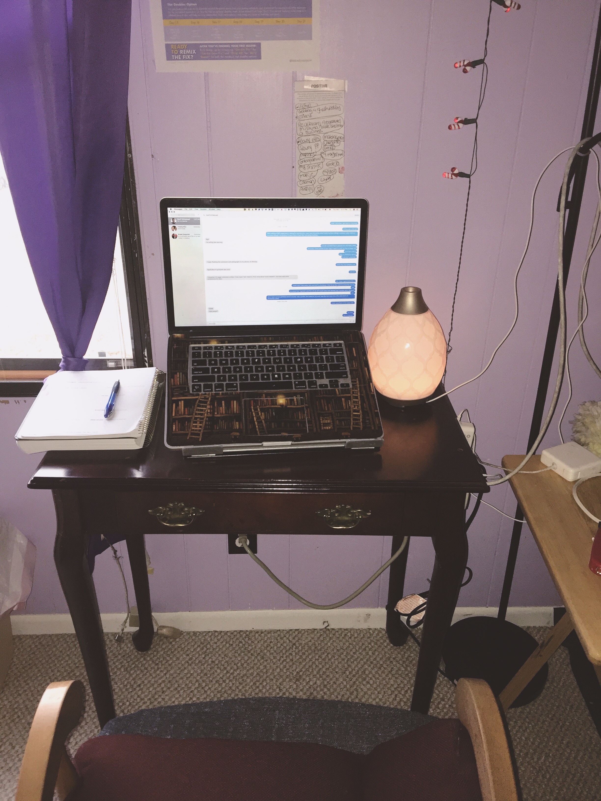 This is my office/room at my parents’ house where I am staying for a couple more weeks. The light thing is a Young Living diffuser where I am diffusing lavender oil and peppermint and you can see my Desire Map planner and I half assed decorated it with papers and stuff I have waaay more in my apartment in Cleveland.