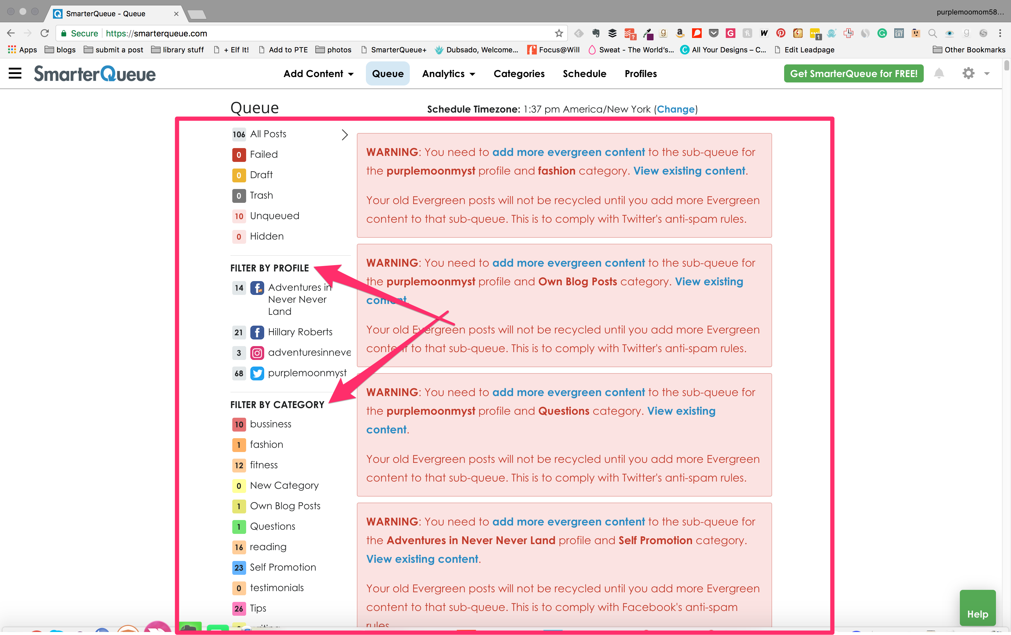 You can see that the bottom arrow is pointing to the categories. You can name your own. As you can see I was not very imaginative with mine. The top shows you what all I have hooked up to smarter queue. I only have four cause that is what I use the most Facebook, Instagram, and Twitter. You can create your custom package. I got the four social media profile and no limit on how many posts and how often I post during the day so I can bug the shit out of all my friends. kiddingnotkidding